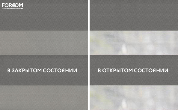 Полотно ткани, состоит из чередующихся горизонтальных полос – прозрачных и непрозрачных. Изменяя положение этих полос относительно друг другу, можно создать целых 3 режима регулировки светом. Например, чтобы в помещении стало светлее, нужно расположить прозрачные полосы друг напротив друга. Если разместить прозрачную и непрозрачную полосу параллельно друг другу, то можно добиться практически полного затемнения.